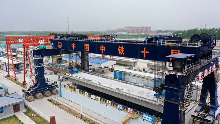 4 月 13 日,在济郑高铁中铁十局济南西制梁场,提梁机在转运箱梁 郭绪雷 / 摄