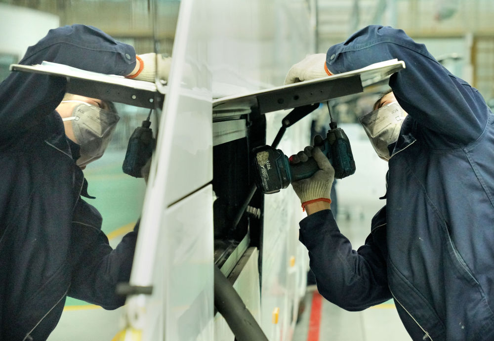 3 月 8 日,工作人员在宇通新能源厂区高端及海外承装车间里作业 李安 / 摄