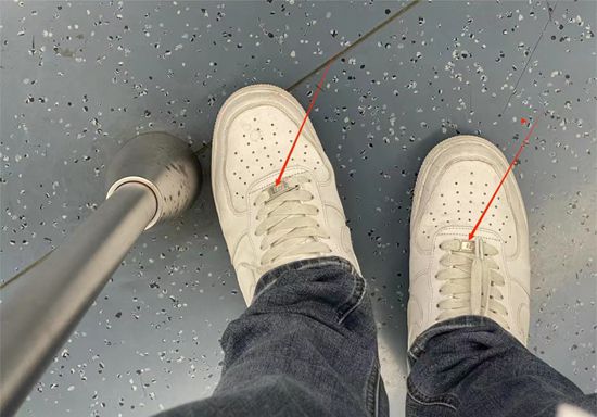 小何被怀疑安装偷拍设备的鞋子。红色箭头指示的位置为“闪光处”。