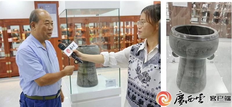 广西清源坭兴文化创意有限公司是一家集研发、生产及销售为一体的坭兴陶文化企业。其秉承对坭兴陶的“文化传承创新、工艺精益求精、服务诚信为本”的理念,不断前行,现所主营的中、高端工艺品、礼品和高端艺术藏品畅销区内外市场。走进广西清源坭兴文化创意有限公司的坭兴陶精品展厅,上百件大大小小的展品让采访团眼界大开。这些展品,有茶壶、茶罐、花瓶等各种造型,别具一格。有的光亮如铜,硬朗如铁,颜色深沉润泽,形体古朴大方,尽显华贵之气;有的还镌刻上文字,如帖如碑;有的雕刻上多种壮族文化图案,似锦似绣。在展厅中央展出的由中国工艺美术大师于2006年创作的“高鼓花樽 ”坭兴陶器,以广西古代铜鼓、长鼓为造型,并刻饰翔鹭、野鹿飞奔往来和古人竞舟、舞蹈欢快场景,因兼具高水准的艺术、观赏、收藏等价值 而荣获联合国教科文组织“世界杰出手工艺徽章”认证。