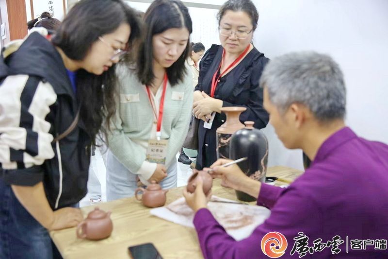 媒体记者观看坭兴陶工艺大师现场献技。记者 覃铮 摄