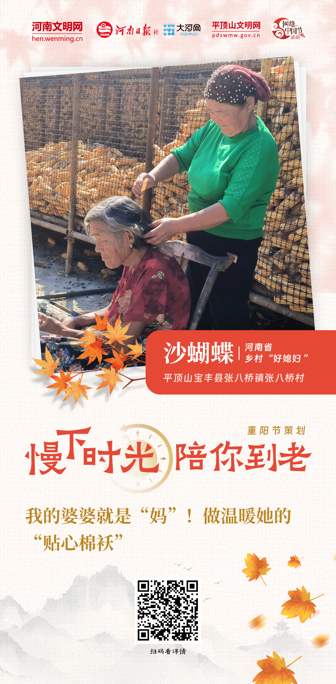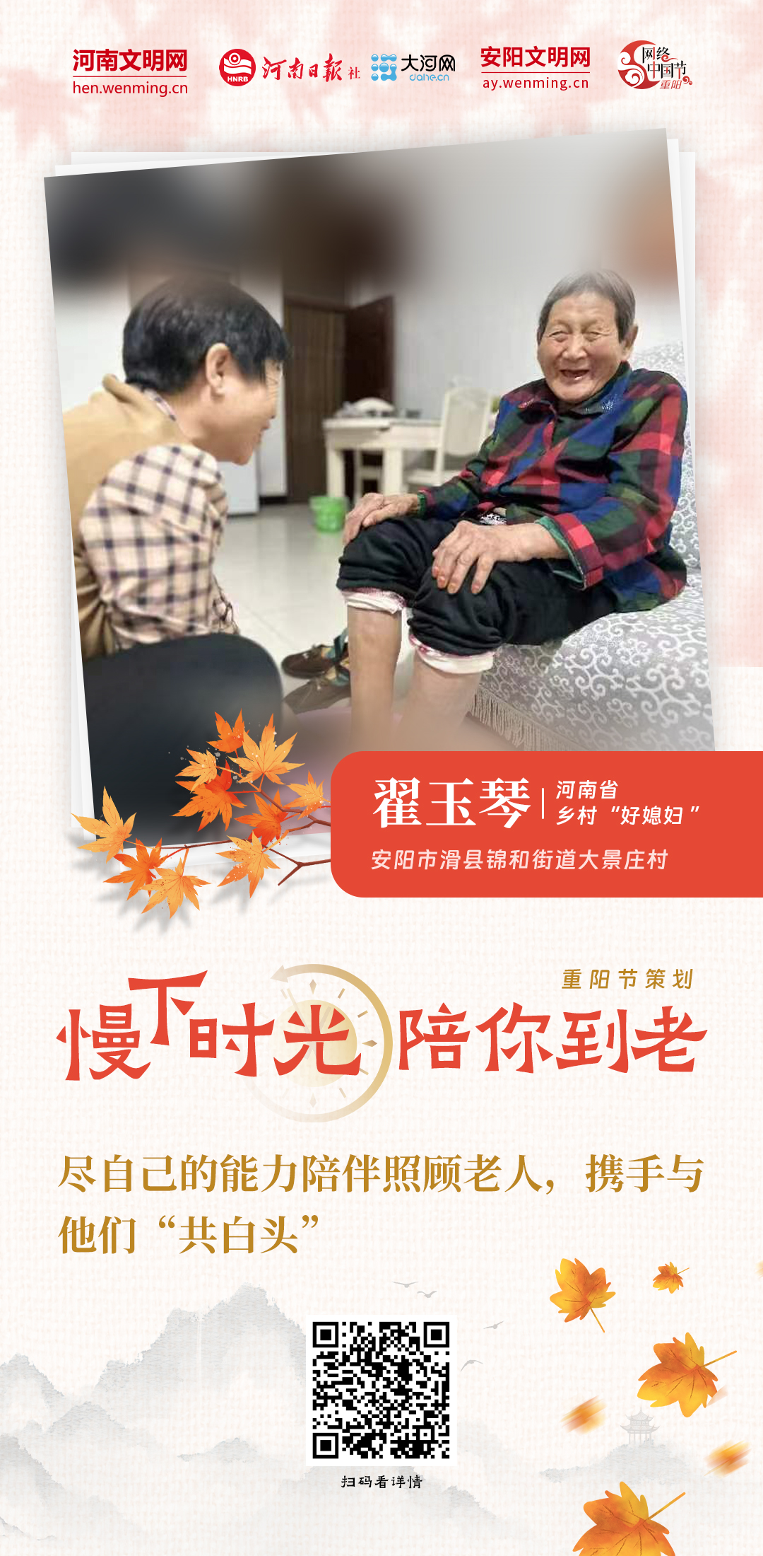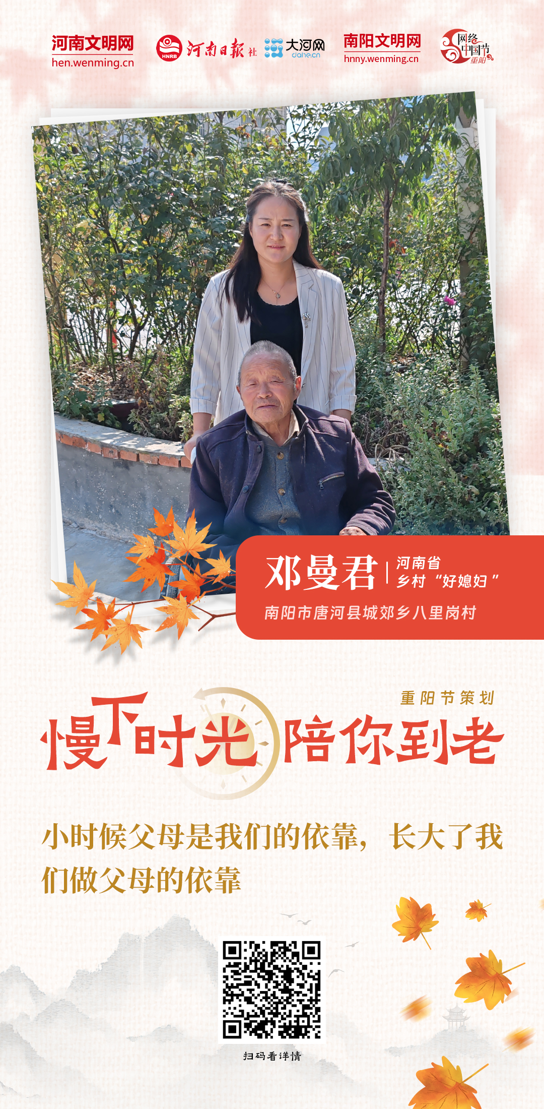 孝老爱亲是中华民族的传统美德,一直流淌在我们血脉里。农历九月初九重阳节,也被称为“老人节”,孝敬老人已成为节日风尚。值此佳节,河南文明网联合大河网推出《慢下时光 陪你到老》主题策划,聚焦河南省乡村“好媳妇”,听听她们慢下脚步陪伴老人的故事。(臧小景/文案 韩雨松/海报)
