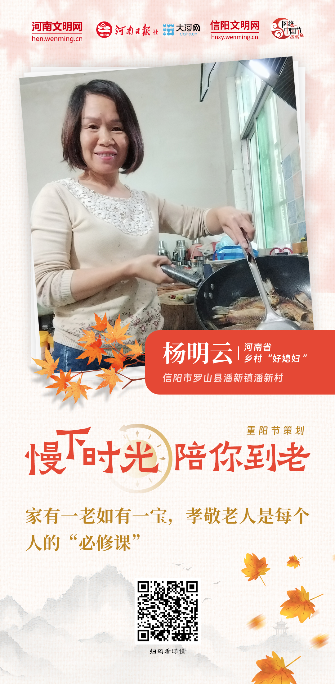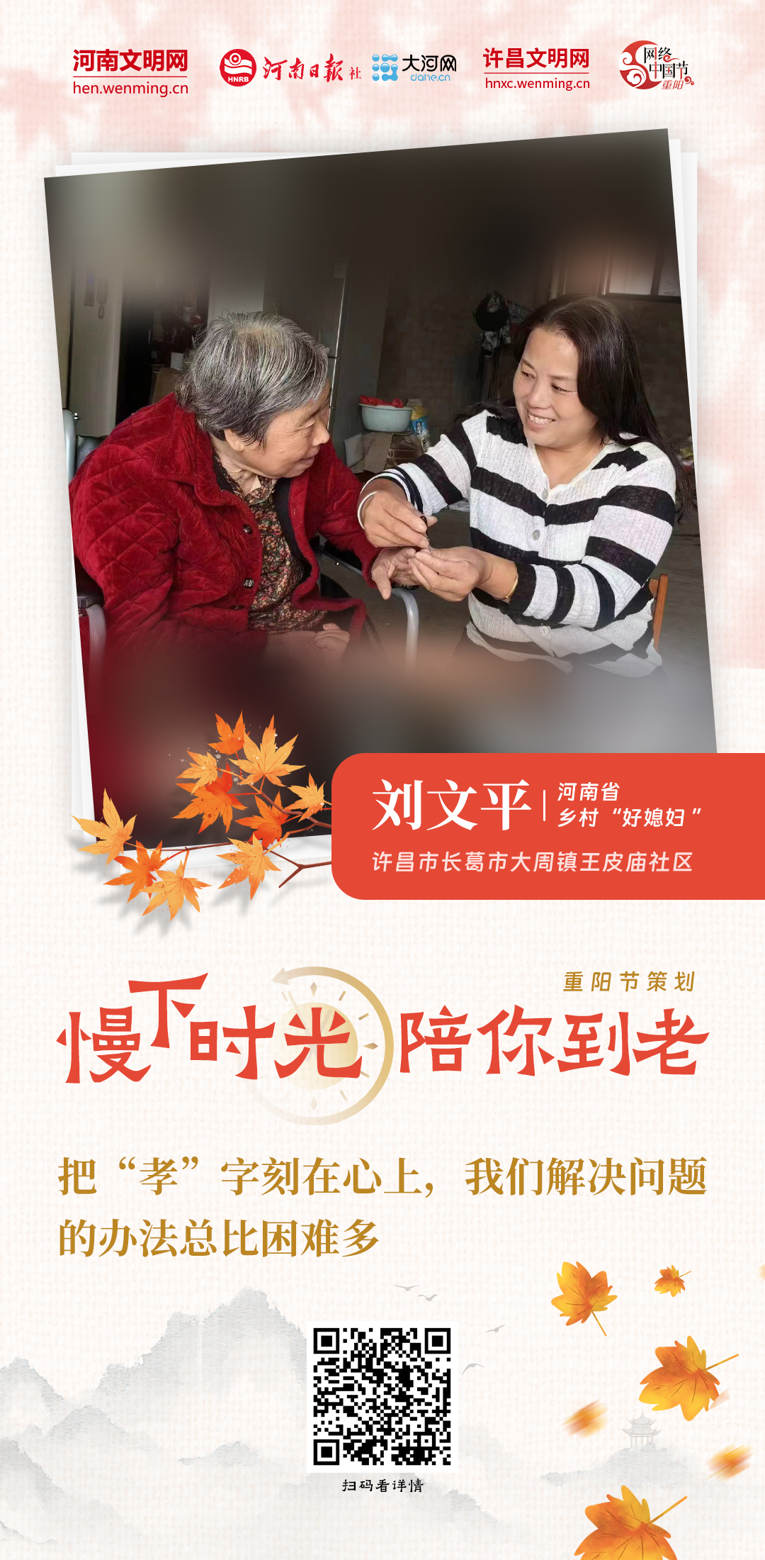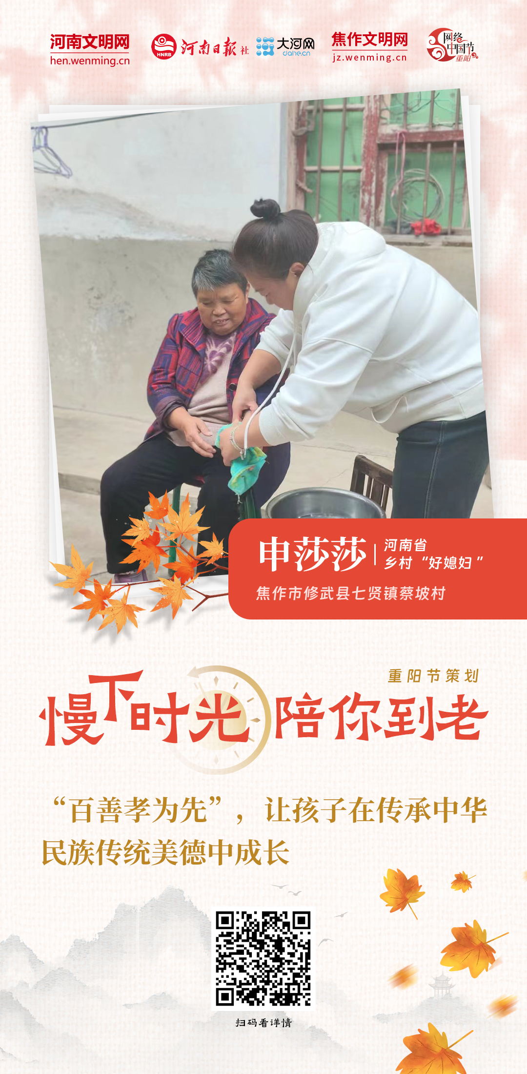孝老爱亲是中华民族的传统美德,一直流淌在我们血脉里。农历九月初九重阳节,也被称为“老人节”,孝敬老人已成为节日风尚。值此佳节,河南文明网联合大河网推出《慢下时光 陪你到老》主题策划,聚焦河南省乡村“好媳妇”,听听她们慢下脚步陪伴老人的故事。(臧小景/文案 韩雨松/海报)