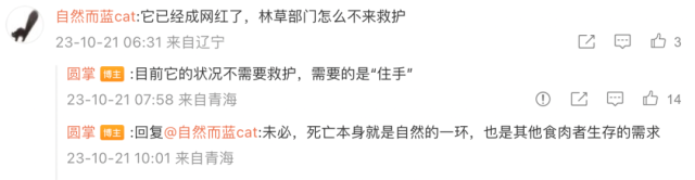 他还在回复中表示,死亡本身就是自然的一环,也是其他食肉者生存的需求……目前这只狼的状况不需要救护,需要的是“住手”。