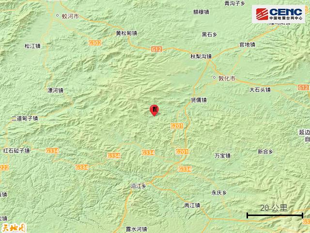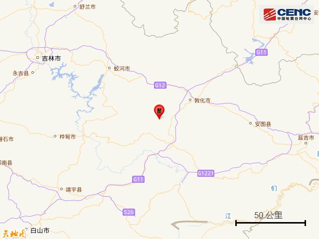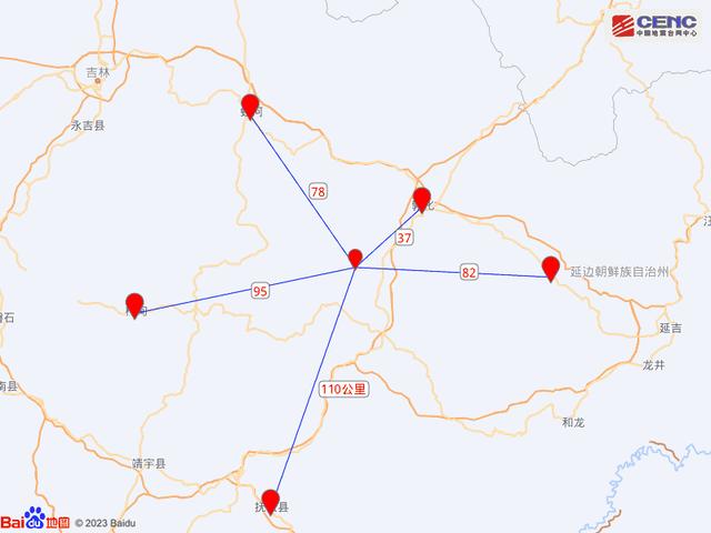 震中距敦化市37公里、距蛟河市78公里、距安图县82公里、距桦甸市95公里、距抚松县110公里,距吉林市133公里,距延边朝鲜族自治州135公里,距长春市223公里。