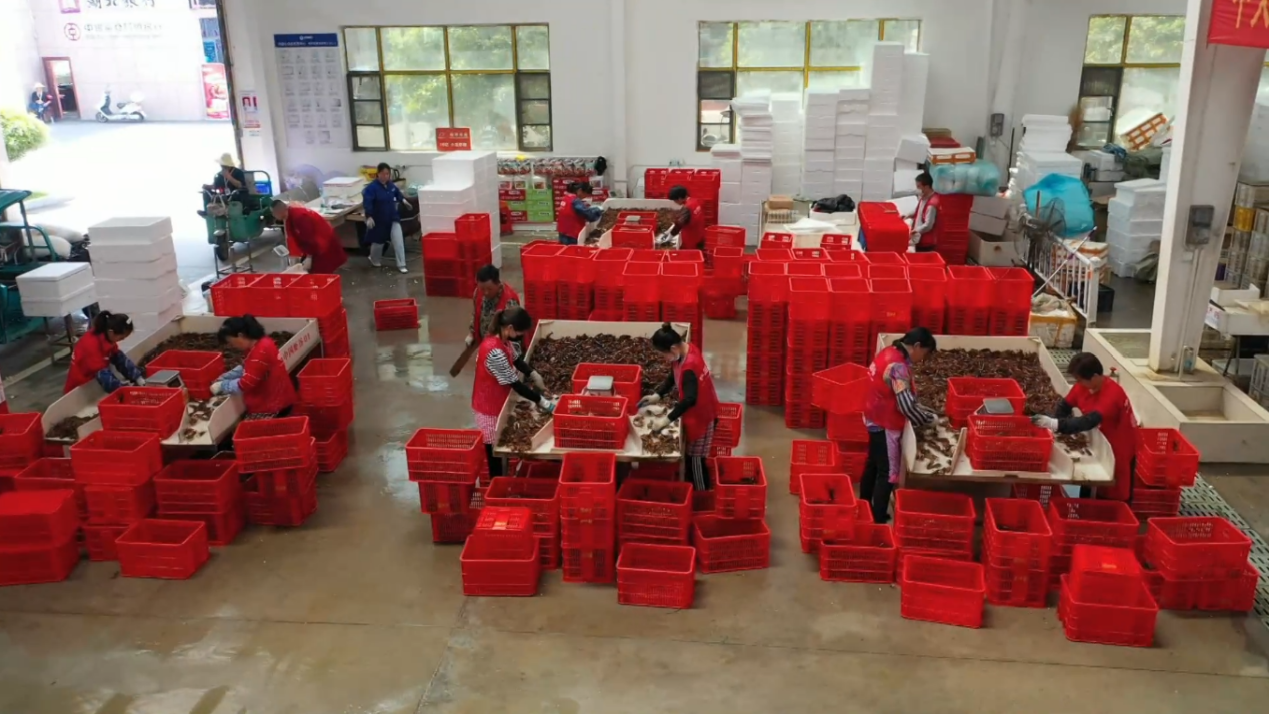 下午四点,在潜江市湖耕食品有限公司,工人们忙着收购新鲜出塘的小龙虾,经过分拣、超声波清洗、蒸煮等流程,一盒盒预制小龙虾就可以出厂销售了。