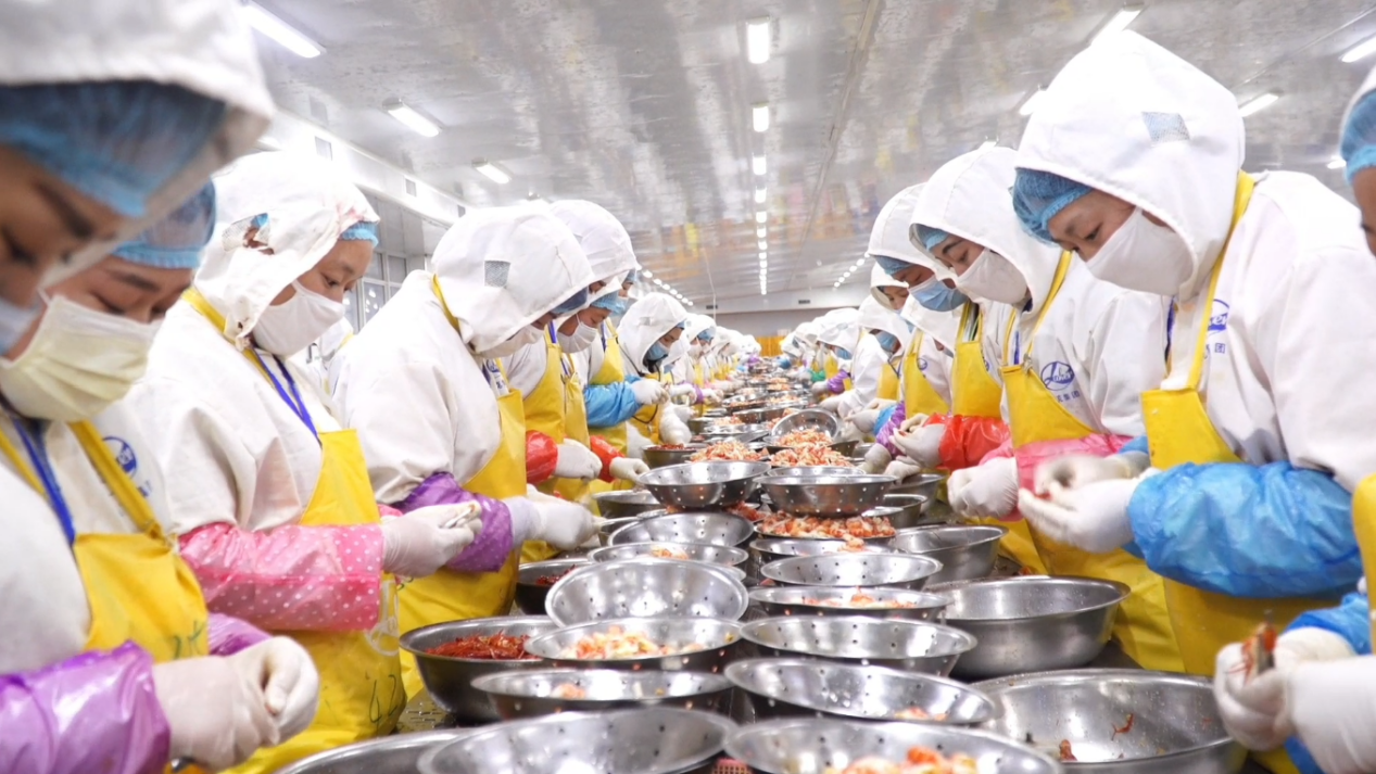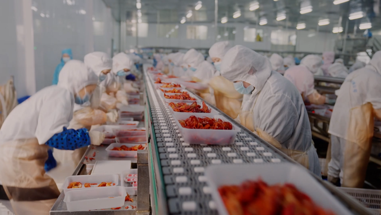 煮熟的鲜红色小龙虾在他们戴着胶皮手套的指尖翻飞跳跃——掐头、去壳、抽虾线、清洗,不到五秒钟,一颗完整的虾仁就被剥好,落入成排的铝制小碗。随后,成吨的虾仁会经历质量检验、再度清洗、包装加味、热熔塑封以及冷冻贴标等工序后,被运往万里之遥的欧洲市场。