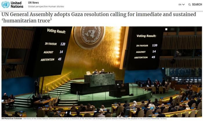 据联合国网站消息,纽约当地时间27日下午,第78届联大以125票赞成、14票反对和45票弃权的表决结果,通过了由约旦代表阿拉伯国家集团提交的一份联大决议草案。