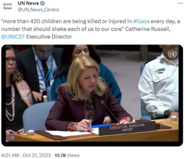 中新网10月31日电 据联合国新闻消息,当地时间30日,联合国儿童基金会执行主任凯瑟琳·拉塞尔表示,最新统计数据显示,目前加沙地带每天至少有420名儿童死亡和受伤。