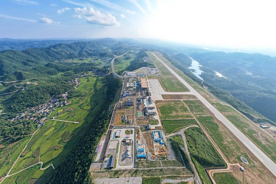 这是8月17日在湖南省湘西土家族苗族自治州花垣县花垣镇老天坪村拍摄的湘西边城机场(无人机照片)。新华社记者 陈思汗 摄
