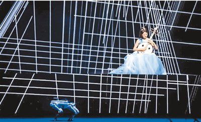 “未来音乐会”上,作品《方圆》由演奏家演奏中阮,结合机器狗运动,融合AI和计算机音乐等技术。本报记者 林子涵摄