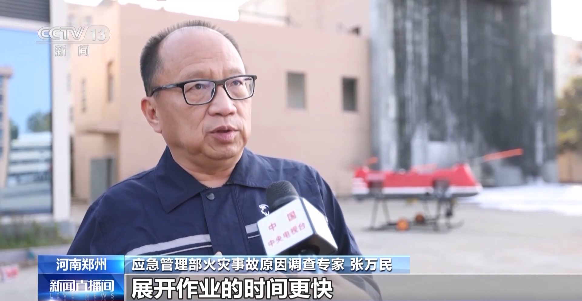 应急管理部火灾事故原因调查专家 张万民:这款装备消防局正在组织开展试点应用示范项目,从未来的角度上讲,加上举高消防车,加上无人机,两种技术手段的结合,可以满足现有高层建筑室外空间灭火技术的要求。