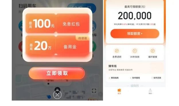 例如,某共享单车App开屏便自动弹出一个“免息红包”和“20万备用金待领取”的贷款广告,在记者点击“立即领取”之后,便显示出申请贷款的页面。