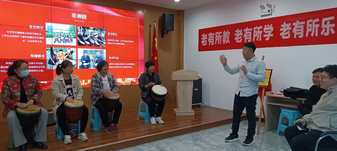 仪式结束后,河南开放大学教师、河南省流行音乐协会现代打击乐协会会长杨攀乐、为大家带来了热情奔放的非洲鼓表演,开启了老年大学的第一课。课堂上,学员们在老师的指导下跟着音乐的律动拍打,现场氛围热烈。