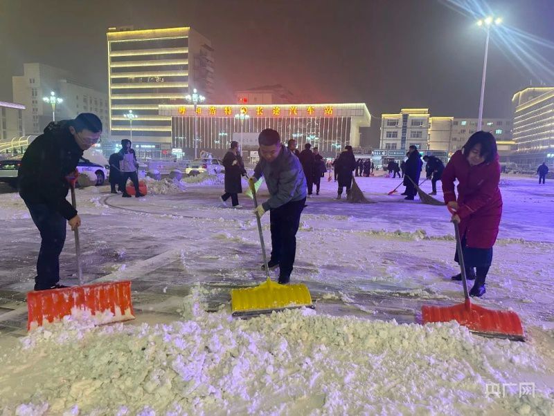 降雪天气下,工作人员正在清扫车站广场前的积雪(央广网发 呼和浩特车站供图)
