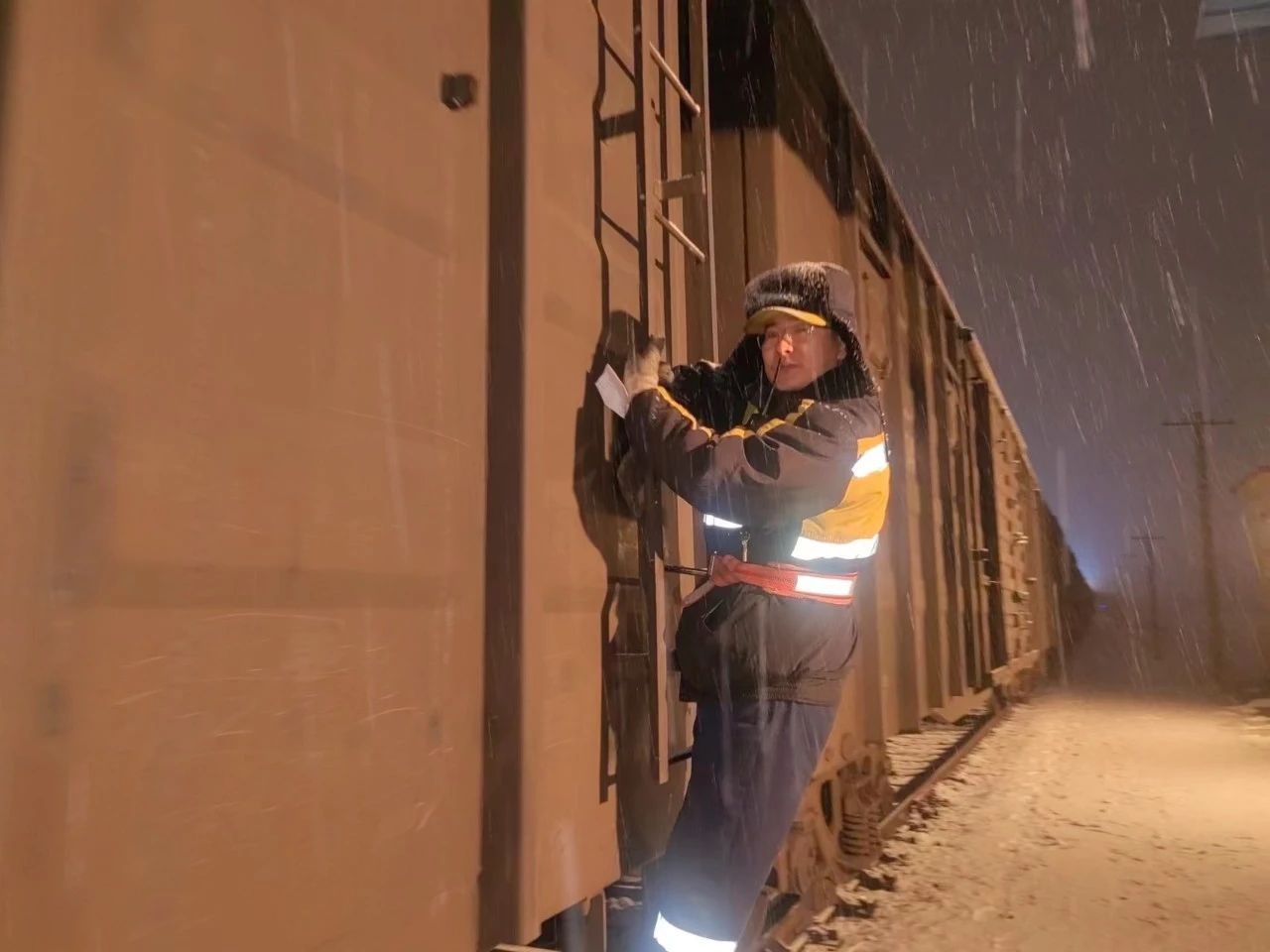 降雪天气下,正在铁路上作业的工人(央广网发 呼和浩特车站供图)