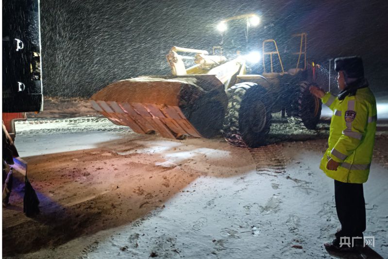 12月10日晚,呼和浩特市公安局交管支队交警在大雪中保障车辆通行(央广网发 云峰 摄)