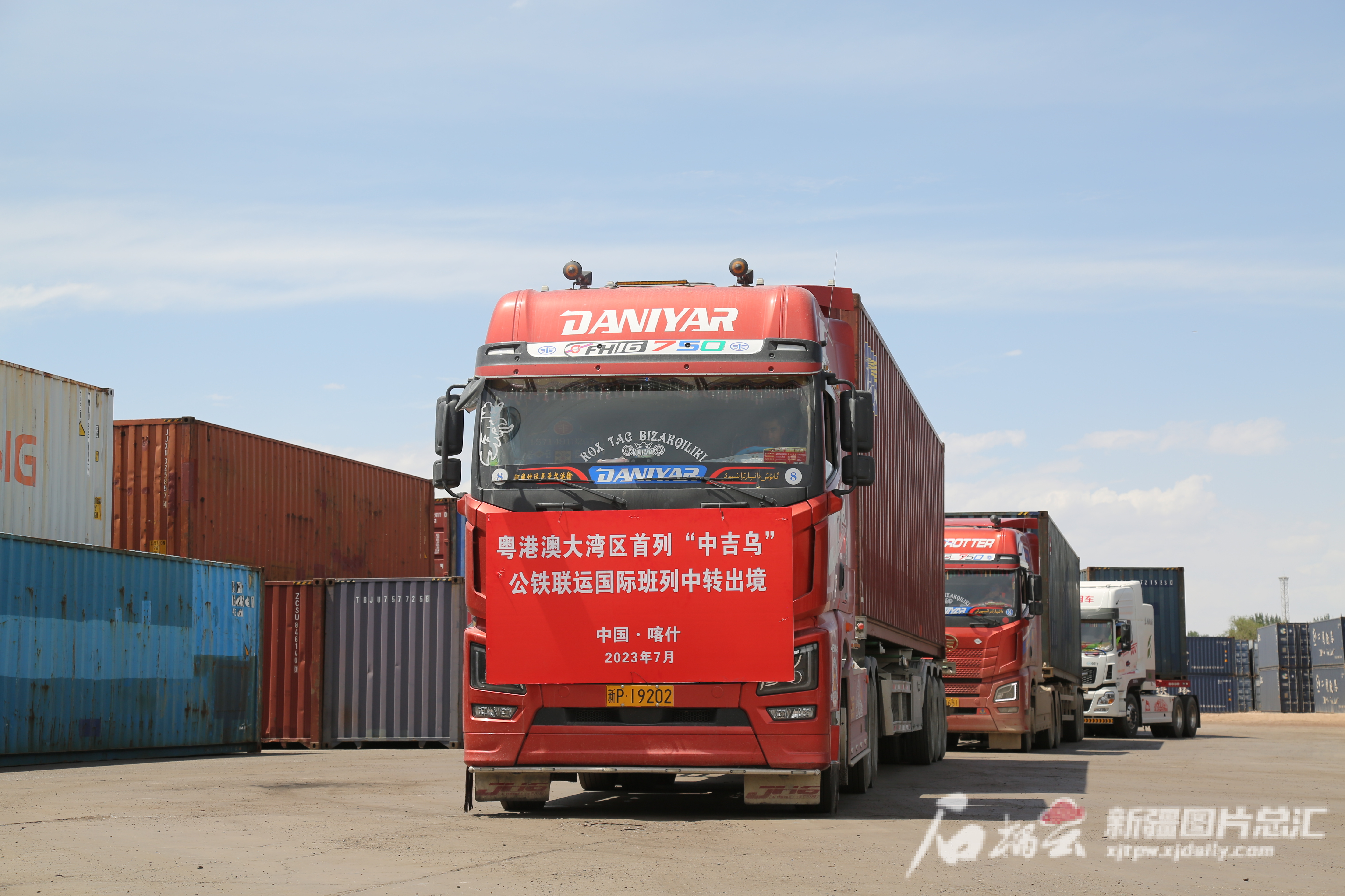 装运首列粤港澳大湾区“中吉乌”公铁联运国际班列集装箱的汽车驶出新疆喀什铁路货场。杨乐 摄