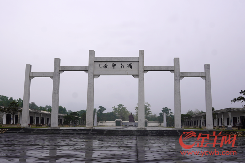 沿石阶而上,身披战袍的冼夫人巨型坐像矗立在广场中央,威严而雍容。冼夫人左手抚掌、右手握拳置于双膝上,象征着冼夫人刚柔并济的性格。在史书记载和历代百姓心目中,冼夫人既是铁腕平叛、威震百越的将帅,又是爱国爱民、护佑百姓的神灵。