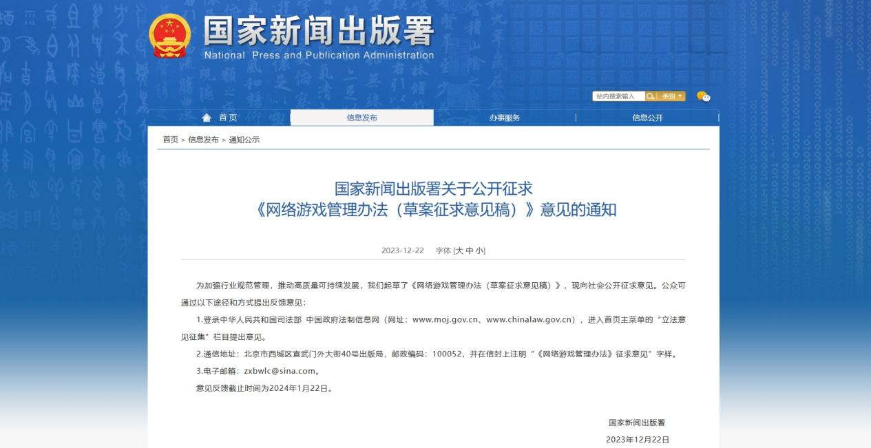 中国青年网北京12月22日电(记者 任洁)12月22日,国家新闻出版署网站发布《网络游戏管理办法(草案征求意见稿)》(以下简称《办法》),向社会公开征求意见。《办法》提出网络游戏不得设置每日登录、首次充值、连续充值等诱导性奖励,所有网络游戏须设置用户充值限额,并且对未成年人保护方面均做出了相关规定。