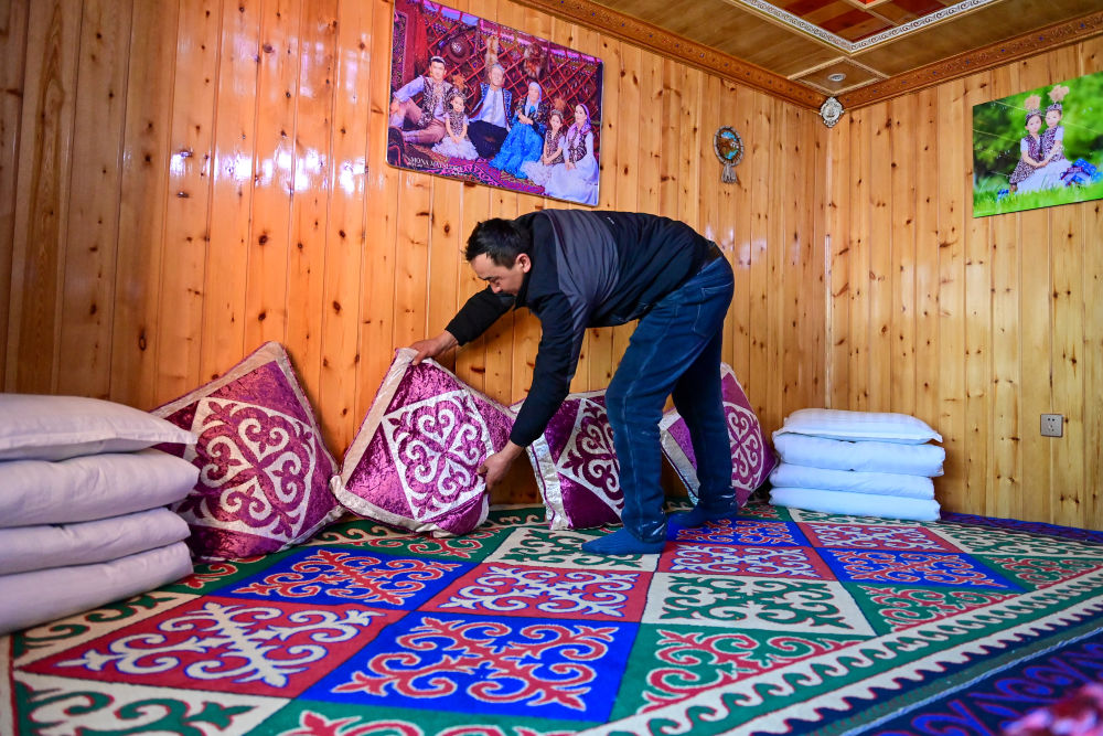 在新疆阿勒泰地区富蕴县可可托海镇塔拉特村,村民在收拾自家民宿(12月22日摄)。新华社记者 丁磊 摄