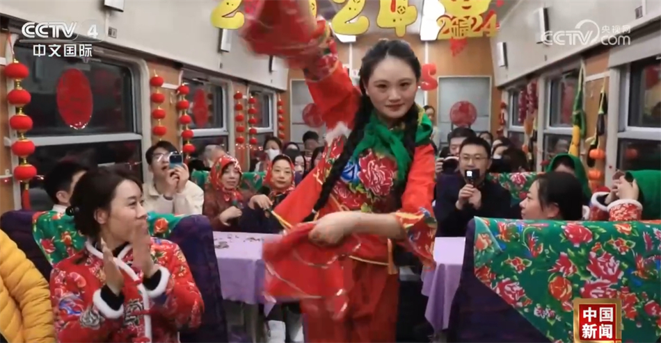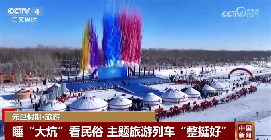 总台央视记者 杨曜语:我即将登上的列车就是从哈尔滨开往漠河的国内首个沉浸式东北民俗文化体验列车,坐过的人都说一上车就想盘腿儿了,我们赶紧来体验一下!一上车我就被浓浓的东北文化所感染到了,整个车厢都被东北大花的经典配色装饰着,再加上随手就能品尝到东北特色美食,坐在床铺上就感觉一秒钟“穿越”到农家炕头。