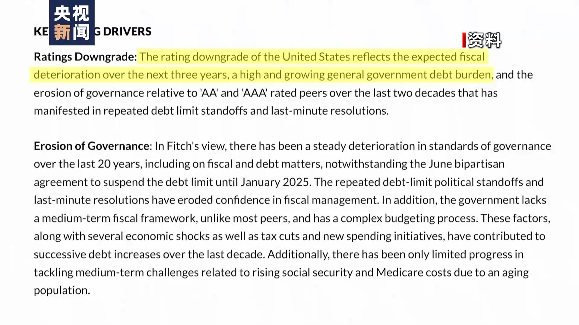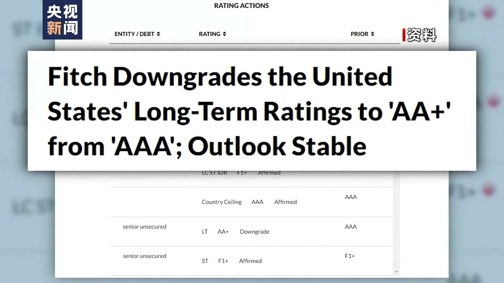 到了2023年8月1日,国际评级机构惠誉将美国长期外币发行人违约评级从AAA下调至AA+。惠誉当天发表声明说,下调美国信用评级主要由于美国政府债务负担居高不下且不断加重,未来3年财政状况预计将持续恶化。