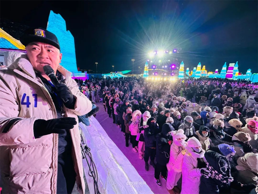 “左脚右脚……”最火爆的室外“万人羽绒服雪地派对”,每晚在梦想大舞台上准时上演,网红“左右哥”和“兔宝贝”带着数万游客在冰天雪地里共同齐舞。“×××,你的孩子丢了,请上台领孩子”“×××,你的身份证丢了”“谁捡到一条黄色的围巾了”……“左右哥”不但是嗨曲主持人,每天还成了冰雪大世界现场失物招领处,主打一个为您服务到家。
