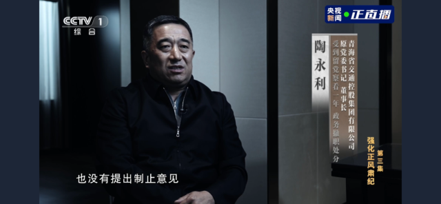 陶永利(青海省交通控股集团有限公司原党委书记、董事长):自己也很清楚,这是不对的,也是违反纪律要求的,但是觉得人的情面大于纪律要求,自己也就破防了,也没有在那里提出反对意见,也没有提出制止意见。