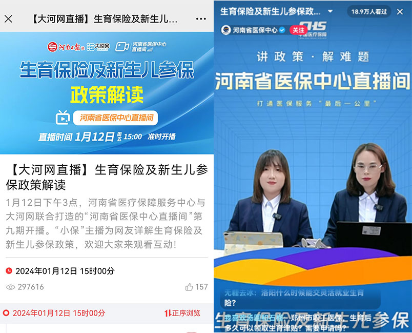 在直播间里,两位主播分别对生育保险及新生儿参保政策进行了详细解读,包括生育保险、男职工生育补助、新生儿参保等内容。