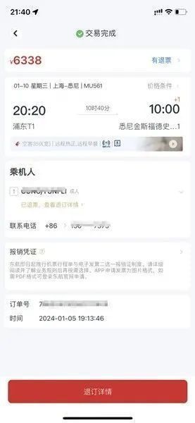“东航App上的字比较小,我没戴着老花眼镜,一不小心看错了。”龚先生讲,1月5日晚7时许,他打开东方航空App,购买了一张1月10日从上海浦东国际机场飞往澳大利亚悉尼金斯福德史密斯机场的机票,为基础经济舱(L),包含税费后的价格为6338元。