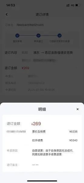 付款后1分钟,龚先生在核对信息时发现买错了日期。于是,他立即在App上选择“退订”,没想到,手机画面上显示的退款金额却让他惊掉了下巴:269元。