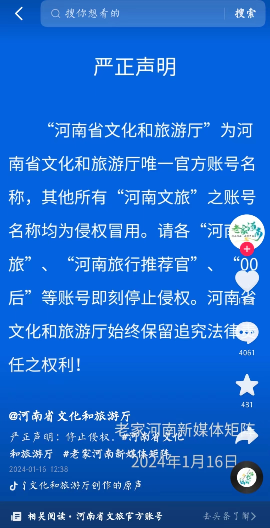 1月16日,河南省文化和旅游厅在抖音平台发布声明称,“河南省文化和旅游厅”为河南省文化和旅游厅唯一官方账号名称,其他所有“河南文旅”之账号名称均为侵权冒用。请各“河南文旅”“河南旅行推荐官”“00后”等账号即刻停止侵权。河南省文化和旅游厅始终保留追究法律责任之权利。
