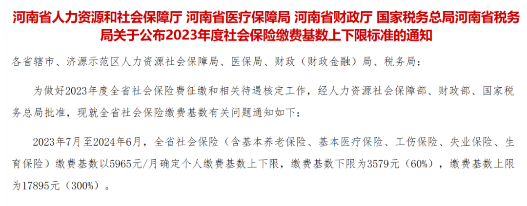 2023年度河南省社会保险缴费基数上下限标准定了:基准为5965元,其中,上限为17895元,下限为3579元。
