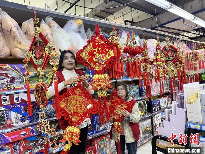 当地超市工作人员准备新年“福”字挂件,吸引顾客采购年货。张峰 摄