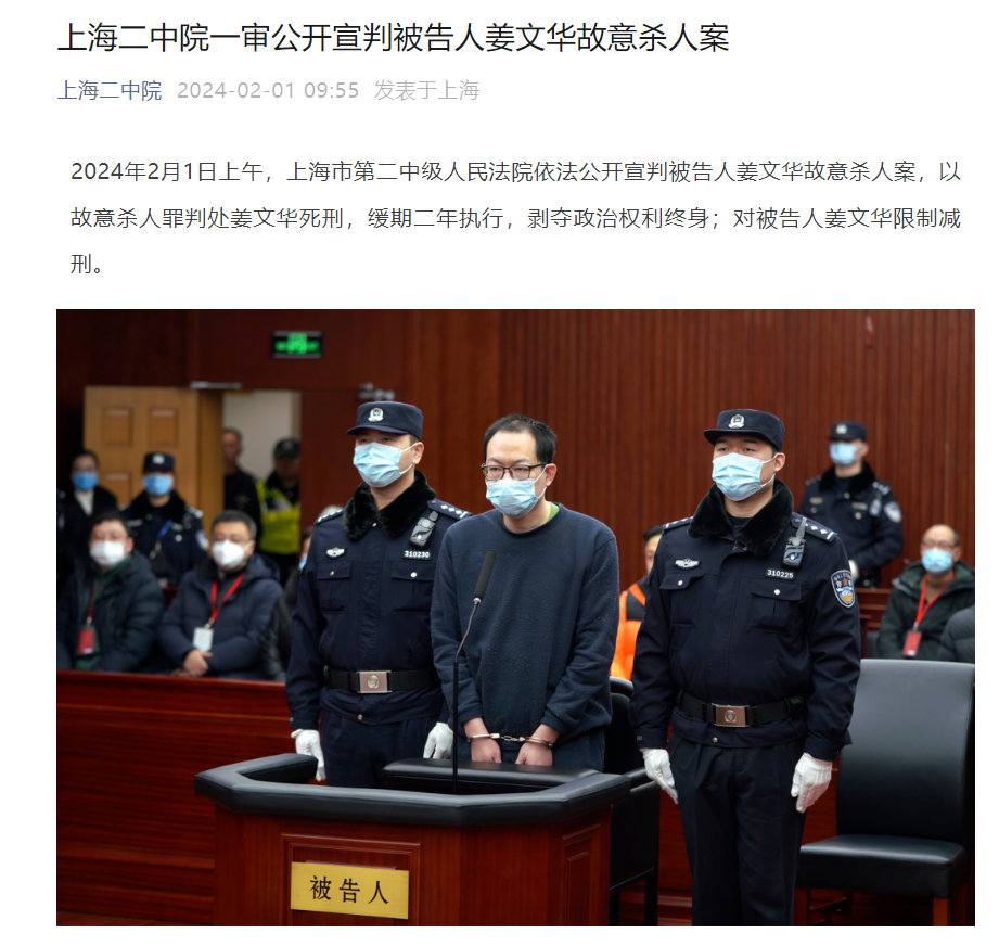 2024年2月1日上午,上海市第二中级人民法院依法公开宣判被告人姜文华故意杀人案,以故意杀人罪判处姜文华死刑,缓期二年执行,剥夺政治权利终身;对被告人姜文华限制减刑。