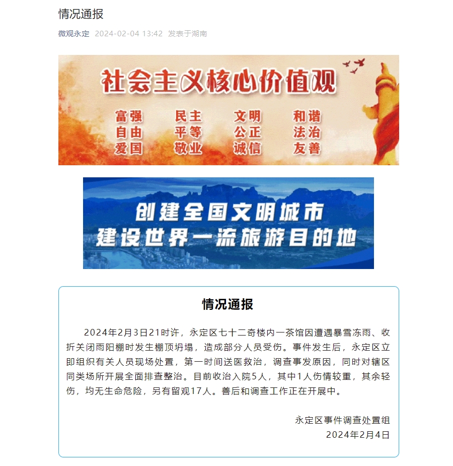 2024年2月3日21时许,永定区七十二奇楼内一茶馆因遭遇暴雪冻雨、收折关闭雨阳棚时发生棚顶坍塌,造成部分人员受伤。事件发生后,永定区立即组织有关人员现场处置,第一时间送医救治,调查事发原因,同时对辖区同类场所开展全面排查整治。目前收治入院5人,其中1人伤情较重,其余轻伤,均无生命危险,另有留观17人。善后和调查工作正在开展中。