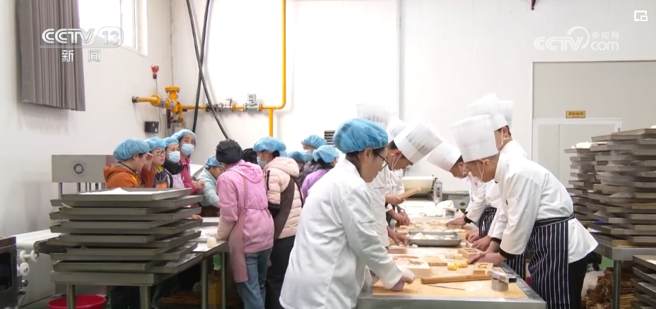 当记者来到这家面食加工厂的车间时,两排操作台边围了二十多位面点师傅。为了能顺利把春节的订单赶完,车间专门新加了一排操作台,中间过道都被堵得水泄不通。