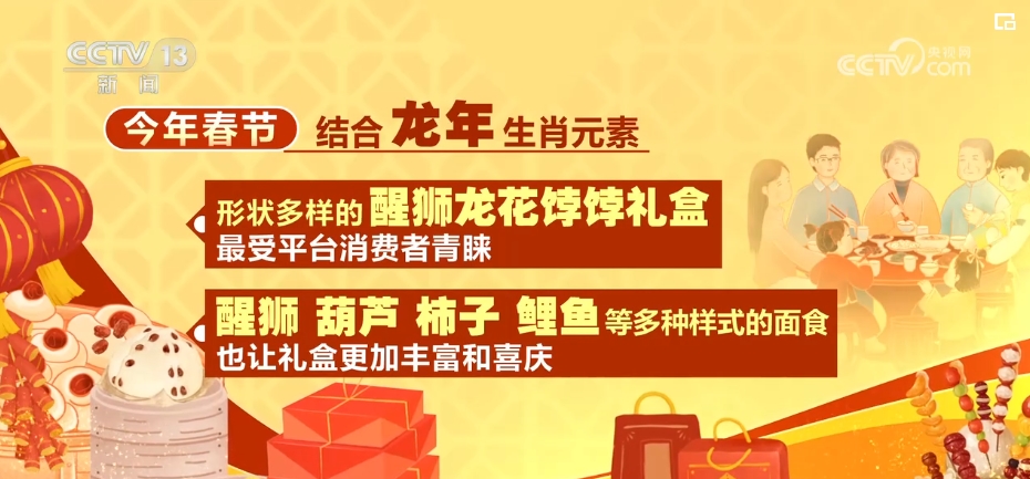 不仅如此,2024年春节,结合龙年生肖元素,形状多样的醒狮龙花饽饽礼盒最受平台消费者青睐,而醒狮、葫芦、柿子、鲤鱼等多种样式的面食,也让礼盒更加丰富和喜庆。