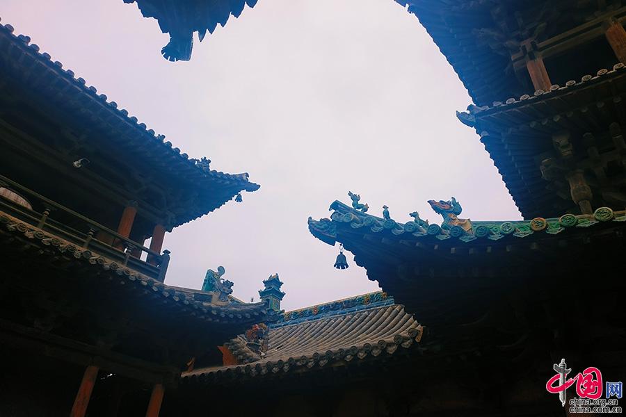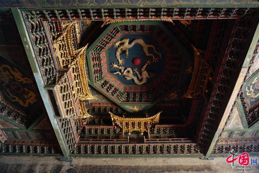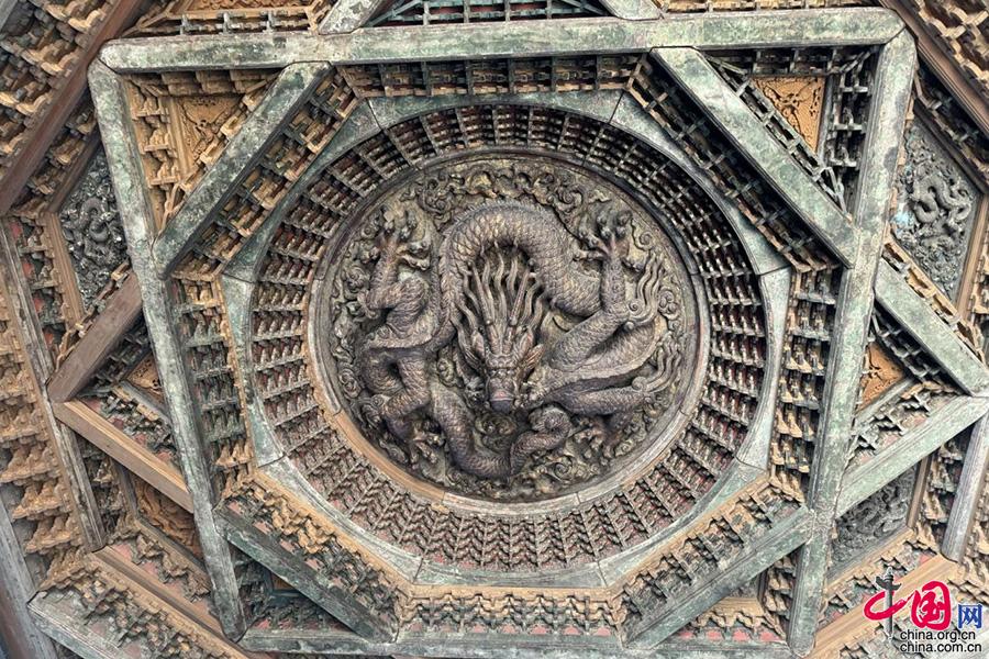 寺中主殿的中央藻井,被称为“八门九星之天宫楼阁”,在方形藻井里又嵌入八角形藻井,下饰天宫楼阁,藻心为二龙戏珠,营造出一方华丽又神秘的空间。(中国网发 许凯章摄)