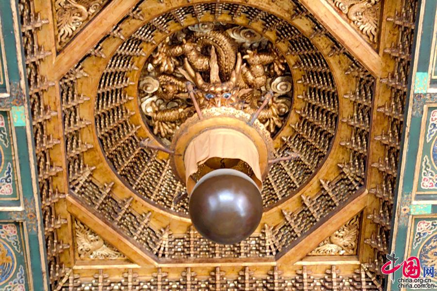 殿中四根沥粉贴金蟠龙柱,顶置八角浑金蟠龙藻井,下设宝座,品级仅次于太和殿。(中国网发芦森宝摄)
