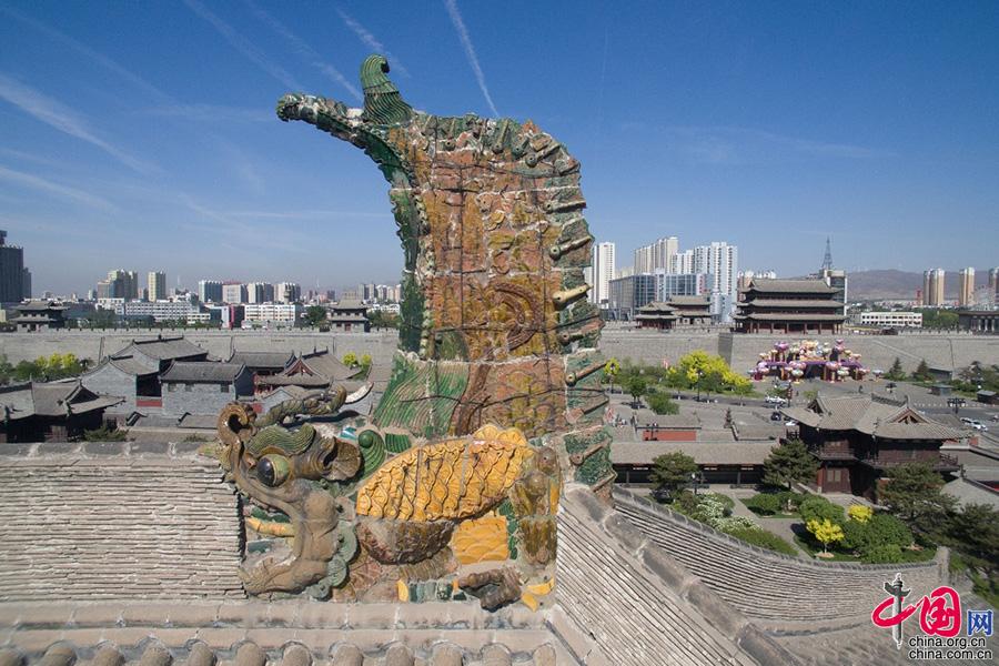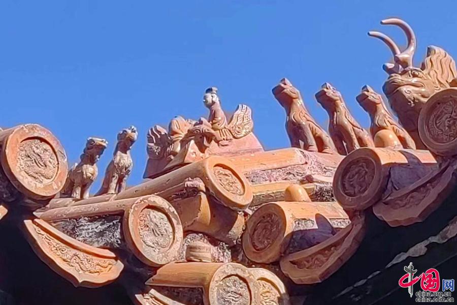 玄鉴楼屋脊檐处有一系列蹲兽,龙的蹲兽釉色以绿、黄为主,眼睛炯炯有神,威严中透着萌态,有镇邪纳福的美好愿望,又使得建筑显得宏伟庄重,也给建筑整体增加美感。(榆次老城景区供图)
