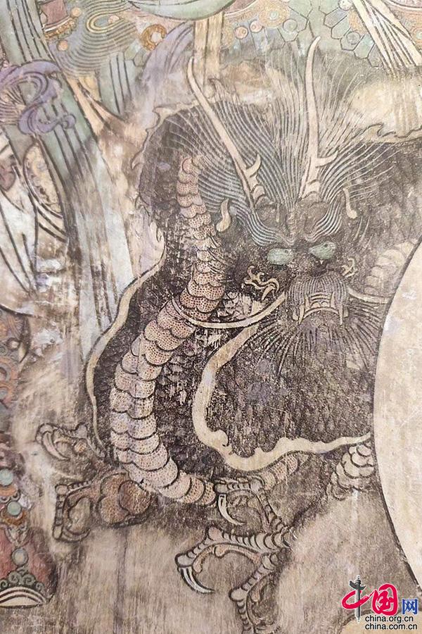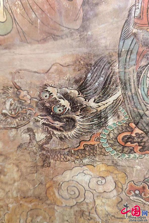 永乐宫三清殿朝元图(元代)。一条出现在玉帝座前,一条跟随在青龙星君身旁,游龙头部扁小,嘴唇尖俏,龙爪锋利、有力,肌肉隆起,与明清时代的龙形象相比明显生动,动感十足,眼睛尤为传神。在展现中国道教内涵的壁画中,皇天、后土的座前会分别绘有龙、凤的图案,来象征他们天地之尊的地位。