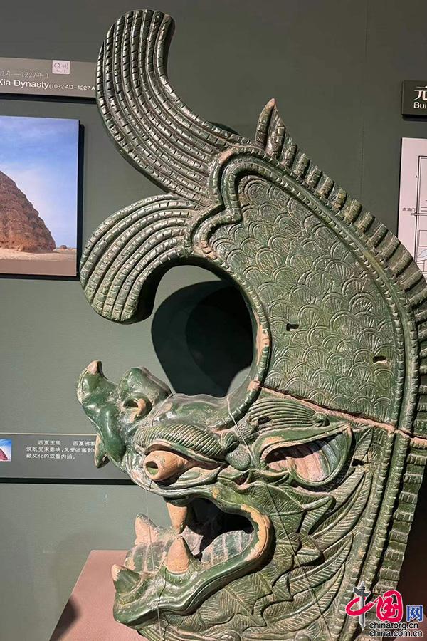 图中为仿制品,藏于北京古建筑博物馆。此件绿釉鸱吻为龙首鱼尾造型,遍饰鳞纹。鸱吻是中国古代建筑屋脊正脊两端的一种饰物,既具备功能性又有美好的寓意。在中国古代,在屋脊上安两个相对的鸱吻,有喷水避火灾保平安的寓意,也可起到严密封固的作用,使脊垄稳固而不渗水。(中国网记者 张静摄)