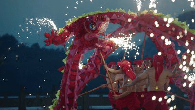生龙活现(放烟花):登场的两条龙,点燃提前放置的焰火筒,在龙珠的带领下,形成“口中火”“脊上火”“腹中火”“导引火”的立体方阵,热烈多彩。