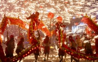 龙在火中飞,人在火中舞。头戴护目镜、穿着短裤的舞龙手,在火树银花中舞动着神龙,任由铁花飞溅在身上也不会乱了步伐。