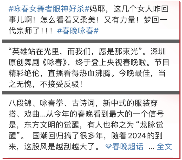 《深圳特区报》在大年初一头版头条对《咏春》做了报道。光明日报原总编辑何东平等首都文化界专家学者在采访中纷纷为《咏春》成功登陆春晚大舞台而点赞。