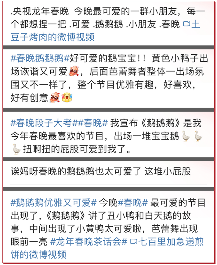 当你提“鹅鹅鹅”,自然要期待“曲项向天歌”。骆宾王、唐诗宋词、中华文化....看到节目单上的题目《鹅鹅鹅》,大概很多观众都以为是要咏诗。当大幕开启,柴可夫斯基的《天鹅湖》奏起,气氛瞬间变得端庄典雅了,可接下来出场的是一群圆滚滚、扭着屁股的小小鹅,这波反差萌,让网友直呼“创意绝了”。