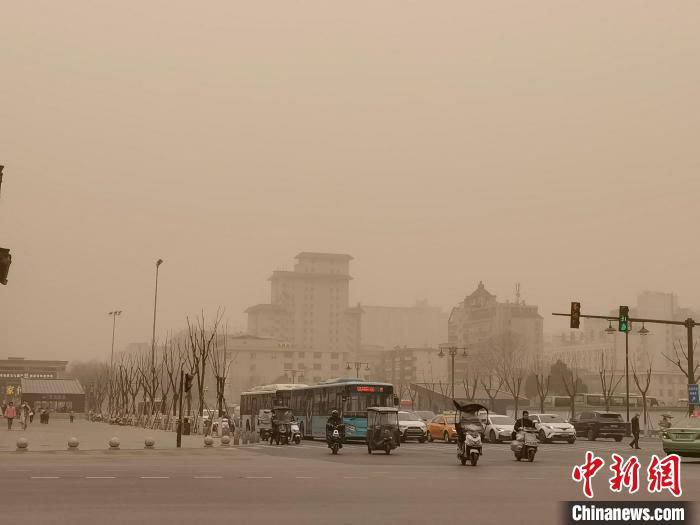 记者在西安市区内看到,天空昏黄,沙尘遮天蔽日,能见度较低,西安钟楼、城墙等建筑物“若隐若现”。