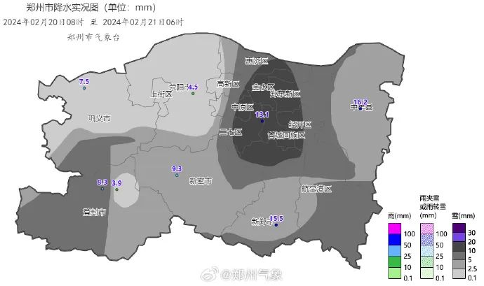 降水:2月20日9时至21日6时,我市出现冰粒、雪复杂相态降水,14时至16时伴有雷暴天气。降雪量(毫米)为郑州13.1、巩义7.5、荥阳4.5、登封3.9、新密9.3、新郑15.5、中牟16.2。